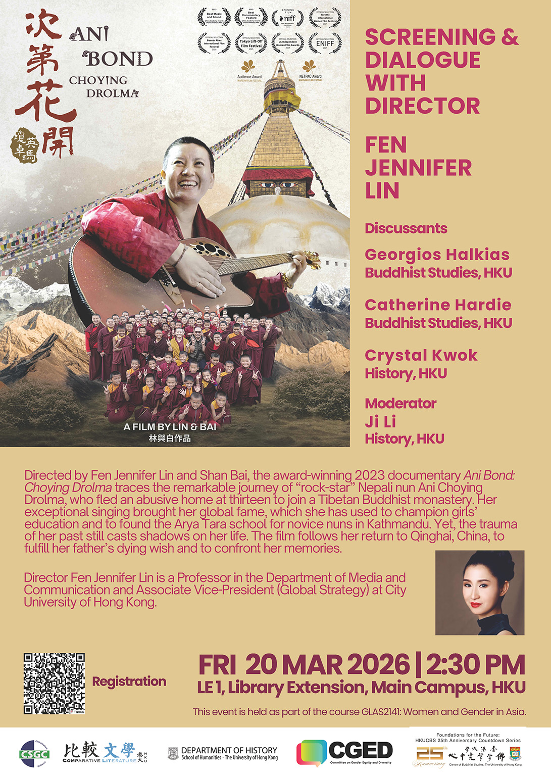 This event is held as part of the course GLAS2141: Women and Gender in Asia, with the support of the Department of History, the Committee on Gender Equity and Diversity (CGED), the Center for the Study of Globalization and Cultures (CSGC), and the Centre of Buddhist Studies in the Faculty of Arts at the University of Hong Kong.