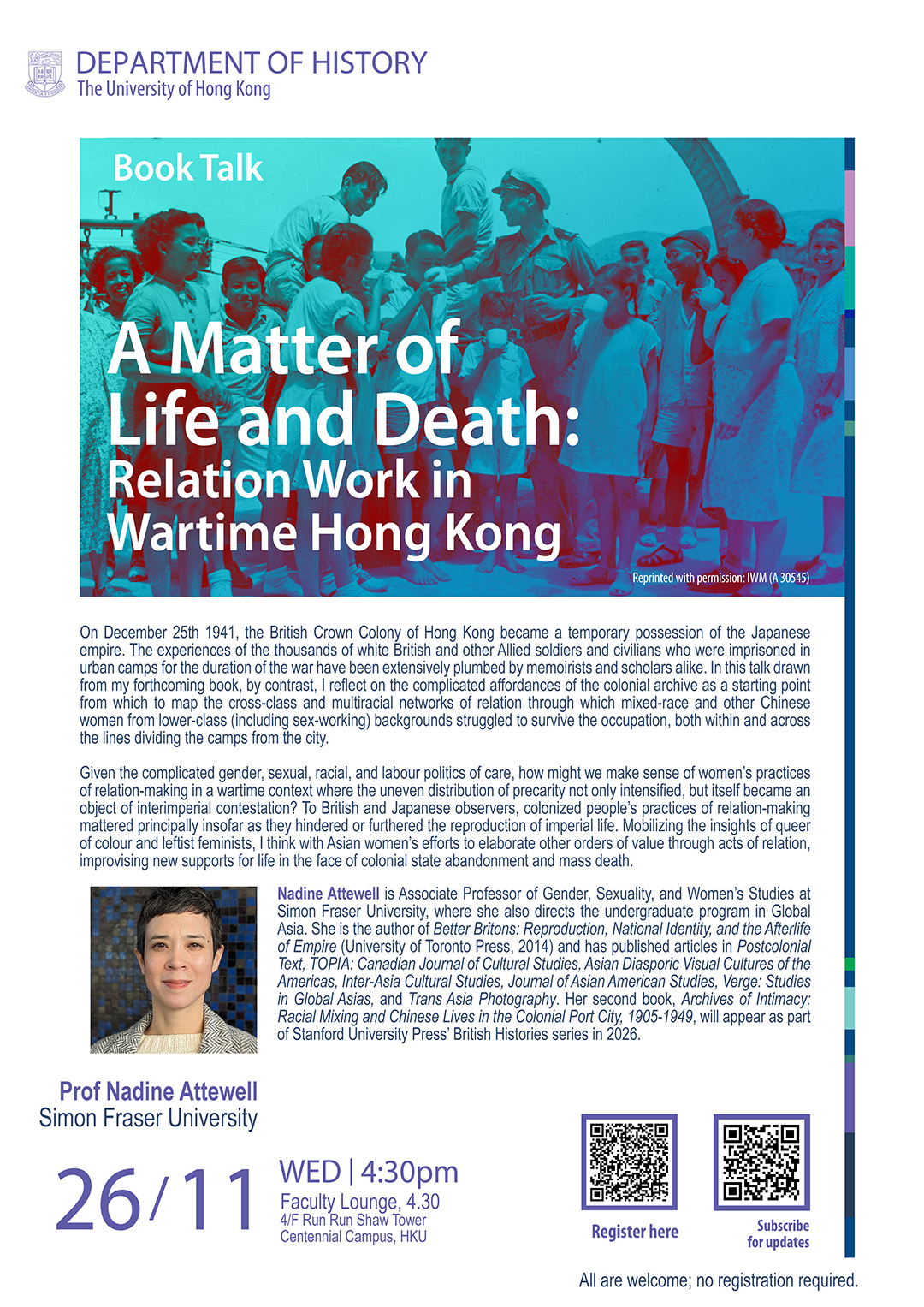 History Talk – A Matter of Life and Death: Relation Work in Wartime Hong Kong (Dr. Nadine Attewell, Associate Professor, Simon Fraser University)
