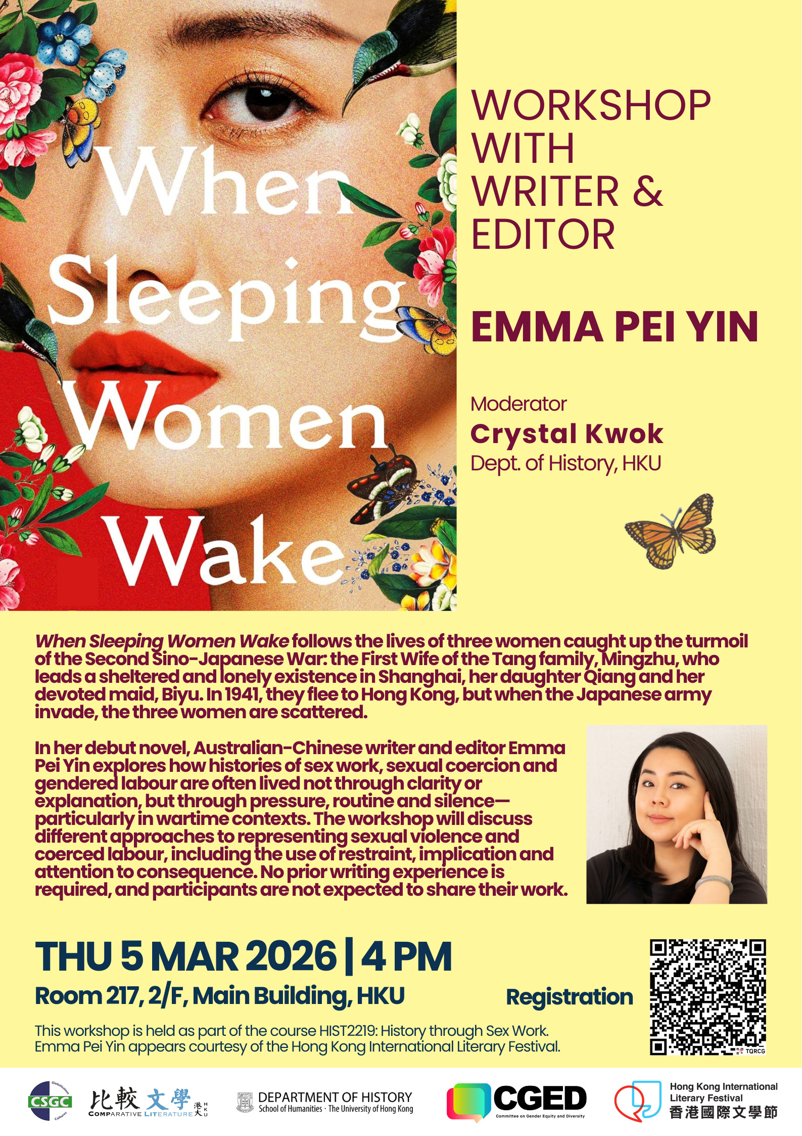 This workshop is held as part of the course HIST2219: History through Sex Work, with the support of the Department of History, the Committee on Gender Equity and Diversity (CGED), and the Center for the Study of Globalization and Cultures (CSGC) in the Faculty of Arts at the University of Hong Kong. Emma Pei Yin appears courtesy of the Hong Kong International Literary Festival.
